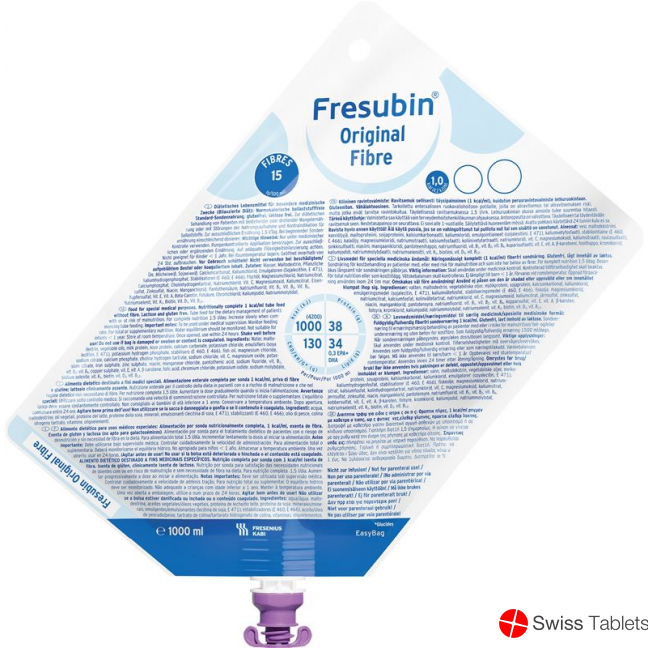 Fresubin Original Fibre Easybag ist eine normalkalorische Sondennahrung, welche reich an präbiotischen und bifidogenen Ballaststoffen ist. Diese ernähren und schützen den Darm, während gleichzeitig die Darmtätigkeit reguliert wird. Ausserdem stärkt das ausgewogene Fettsäuremuster das Herz-Kreislauf-System, die Gefässe und das Immunsystem. Dadurch, dass die Nahrung alle wichtigen Vitamine und Spurenelemente beinhaltet, eignet sich dieser für Patienten, bei denen eine ausreichende Versorgung mit allen wichtigen Nährstoffen über die normale Nahrungsaufnahme eingeschränkt ist, wodurch es zu Mangelerscheinungen kommt. Diese Sondennahrung ist zur ausschliesslichen Ernährung geeignet.